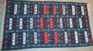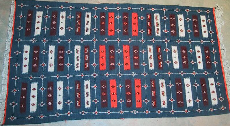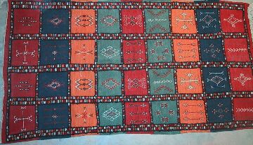 Piece 3.12724 is also by Jamila. It is an akhnif or flatweave, with the squares in it separated by borders of pile. The colors are a rosy pink, soft gold, dark denim blue and a dark green. You can see them better by clicking on this photo to enlarge it, or by clicking on the close-up. In each square, designs are embroidered. It measures 3'8" x 6'10" and costs $250. SOLD
