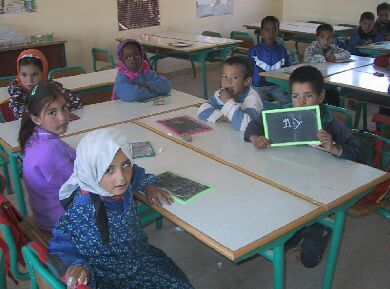 There is also another recent change. On my March 2003 visit to N'kob, the school principal Si Houcine suggested that perhaps rug sales could help the village primary school a bit. He knew that a percentage of each sale goes to help the village development association, which in fact contributed it to help the school build latrines. The principal suggested that a small percentage, like 2% of the weaver's price (not subtracted from her price, but added to it), might go toward the needs of the primary school. There is a village PTA (Parent-Teachers Association) and the money is being put into their account; in fact, they needed a minumum balance of 600 dirhams or about $60 to open it, and much of that was from their 2% on each rug sold. Thus sales of the following pieces will help improve the primary school for these village children.