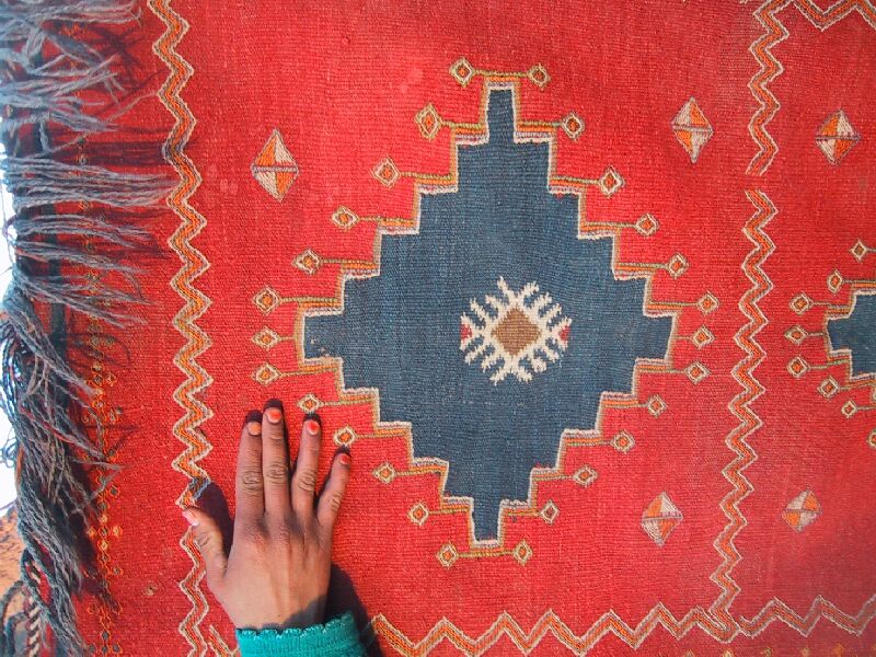 Piece 2.11429 reminds a friend of a Native American flatweave, and there is some speculation that Berber designs on Spanish saddlebags and rugs reached the Southwestern US hundreds of years ago. The main colors are red and an orang-gold, with a bit of blue in the center. You can see the detail, including the finely-woven designs, if you click here. It measures about 4' x 6'9" and costs $345. SOLD, but you can have the same piece woven to order.