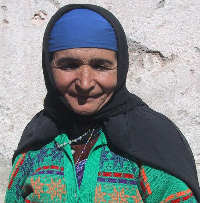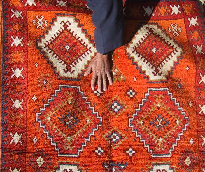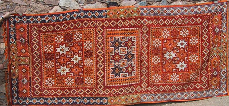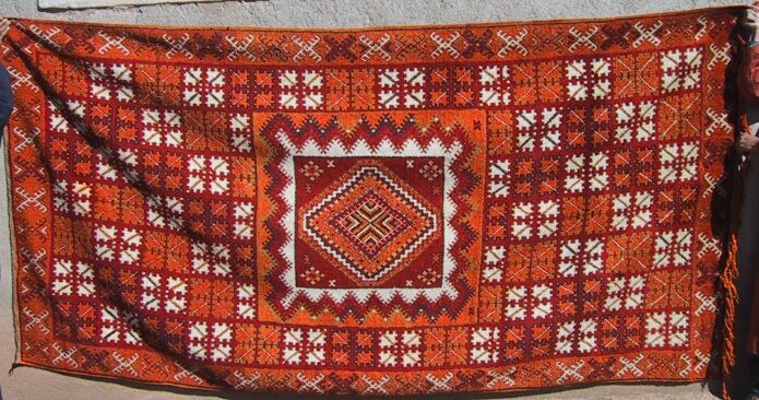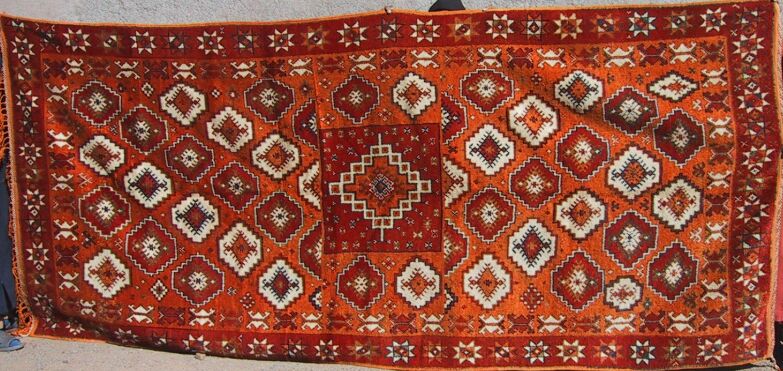 This is Rqia Akhrass, a dignified older woman in N'kob. Her family said she made the four rugs below in the sixties, and they have kept them in good condition until now. Notice the difference in colors and design from most of the N'kob rugs you've seen. These are mainly red and orange, and the designs appear to be more overall than the three-panel style. In fact, three of the rugs below have three sections, but they are much less marked than in most of today's rugs. Rqia lives with her aging and blind husband and her three sons' families, all in one home. She also has three daughters, but they too are grown up and have married and left. The pretty Khadija Id Yassine above is one of her daughters-in-law, and the village maqqadam or local official is her son. You will notice these prices are much higher than other pieces. One reason for this is that they are older and in excellent condition: you rarely see items like this for sale any more. Again, the men set the prices and I did not discuss them.