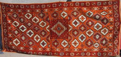 Piece 3.13572 is a long older pile rug with an orange ground and red-orange and white designs. Notice how they are in diagonal rows of the same color, almost forming a V under the center panel. And notice how they appear to be peeking out from behind that panel. In the close-up you can see how well the red and orange harmonize. You can also see there how some designs are outlined in navy blue or a soft olive green. The wool also has some sheen to it, found in some older rugs. This piece measures about 5'4" x 12' (162 x 365 cm) and costs $5100.