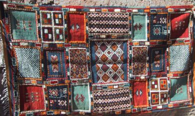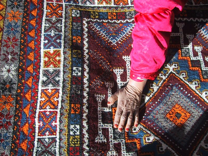 This is Fadma Bourais and she made the rug below. She has three children, two married daughters and a son who is in junior high school in the town of Ouarzazate about 2 hours away. The village only has a primary school, so further education means boarding in town, and this often stops girls from continuing. Her husband sells vegetables in the same town and comes home on weekends; he and the son probably share housekeeping in town. Fadma made the rug by herself in seven months. When we asked what she would do with the money, she first said "buy tea," meaning household expenses, just for one month. When we said we thought it should cover more than that, she said "not even that." Another thing she needs to buy are school books and supplies for her son.