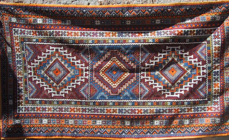 Piece 3.13627 is a large knotted Tazenakht rug with a clear design on a maroon and true blue ground, accented in white, not-too-bright orange, and a bit of olive green. You can see the well-drawn designs and the several borders more clearly on this close-up. While it does not quite lie flat, a rug pad should make it do so. The size is about 5' x 9'1" (152 x 277 cm) and the price is $745. SOLD