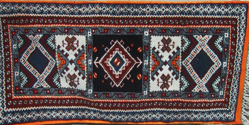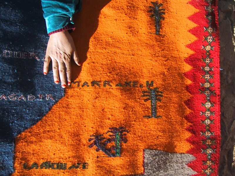Piece 3.13630 is really unique: it is a map of Morocco, and I've never seen another like it. Jamila said she designed it herself. It is a medium sized flatweave or akhnif, but I wondered if Moroccans or Moroccophiles living outside Morocco might want to put it on a wall as a decoration and/or conversation piece. On the close-up you can see the city names and palm trees more clearly. The colors are a bright red, gold-orange, denim blue and natural brown for the sand of the Sahara at the lower right. It looks a bit lumpy here, but should lie flat with a rug pad. It measures 3'6" x 7' (107 x 213 cm) and costs $245.
