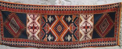 Piece 3.13639 is a small narrow pile rug that could be used as a runner. It has five central panels and two large borders, with the main colors a rich red, dark blue and black. Notice how the design has similar elements to the rug above. There are accents in orange, gray, and a bit of pale sage, seen best in this detail. The size is about 2'4" x 5'4" (71 x 162 cm) and it costs $205. SOLD
