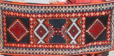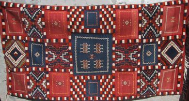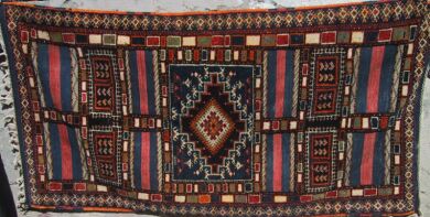 Piece 3.13644 is a medium rug in the Glawa style, meaning it has three different kinds of weaving. Here the plain pink and blue stripes are flatweave, the center and side panels and borders with designs are in pile, and the black and white designs you see at the top right in this detail are made by twining. Accent colors are a rusty gold and sage green. The size is 3'6" x 6'11" (107 x 211 cm) and the cost is $405.