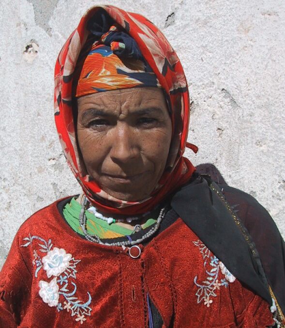 This is Fatima Jazouli, whose work you have seen before. She made the red and black man's cape that you saw earlier in these pages. She is married, and when I asked what her husband did, she said he "sits in the sun" (and waits for money). In fact he has a little land and farms if there is enough water. His two sons from a previous marriage live with them and they help out with farming and herding sheep. She has four daughters, three in school and one out. If this rug sells she will use the money to buy flour, sugar and tea - the basic food supplies. If there is any left over, the girls want new clothes. For herself, she would like to buy something like dishes or clothing from the traveling peddler when he comes through.