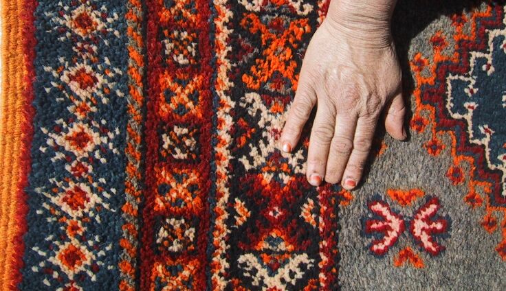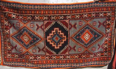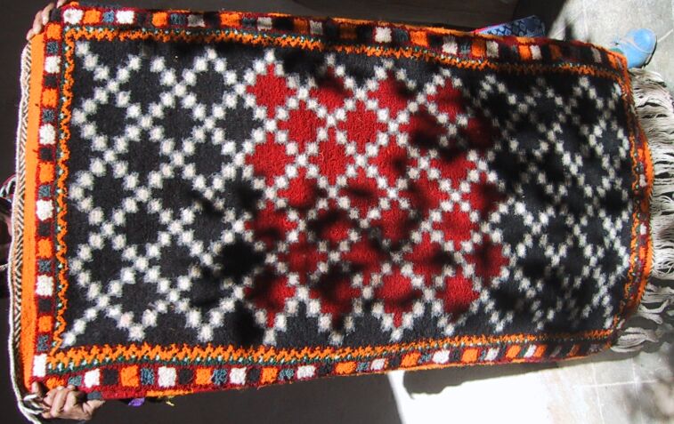 Piece 3.13663 is a small pile rug in the lattice design in the usual colors of black ground with a gray and white lattice. The blue-red center is unusual in this rug. The boders have other colors, including orange, a gray-blue, and a bit of dark green, seen above the thumb in this detail. Don't worry about the black 'spots' on the rug: they are shadows from a tree. This piece measures 2'3' x 4' (68 x 122 cm) and costs $125.