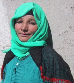 This is Aicha Aqubab and she made the piece below. If you saw a short piece on this rug project on CNN International in the fall of 2003, you will remember her in her green scarf: in the film she looks very proud of her rug, shown below. Her husband is a shepherd and they have five children, four sons and one daughter. She and her sister made the rug below together; they are married to two brothers and live in the same household. The rug is about ten years old and took them two months to make.