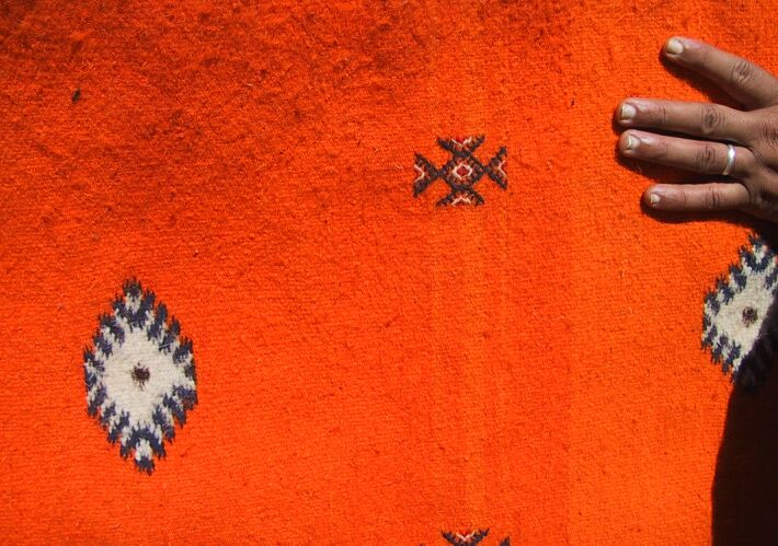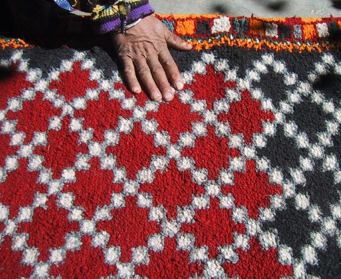 The rug below was made by Kebira Izourne who is from a nearby village but currently lives in Tazenakht so was not available to be photographed. Her husband Ahmed is from N'kob and works in the office at a cobalt factory near Tazenakht. He is also a member of the village development association, and helps with the rug project by assisting with measurements, running funds through his bank account, and corresponding with me via email about orders and addresses. You can see him on the left in the photo of the cell phone site.
