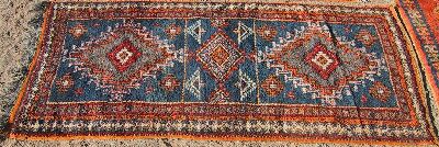 Piece 2.11418 has three central panels and soft colors. A main color is the dark blue ground with some abrash or color variation in it, valued by collectors as a sign of handmade rugs. You can see it best in the left panel of the rug if you click on the photo here. There is also gray in the diamond shapes, and a rich red and bright gold. You can see the intricate designs best on the close up. The size is 3'9" x 7' and the price is $525.