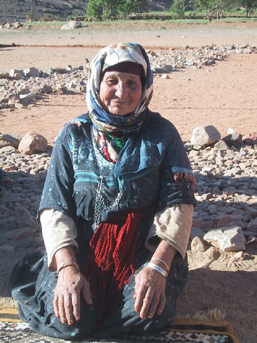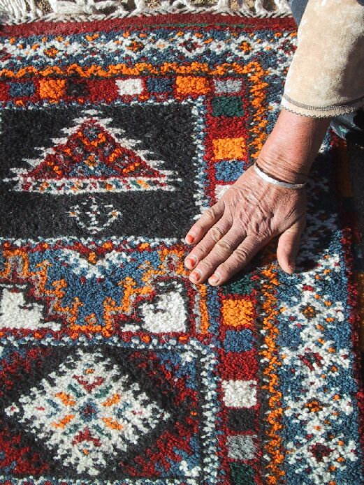 This is Sheeto the grandmother of Samira, the young woman in the green sweater who helped me so much. At first she didn't want her picture taken (I always ask permission), but I'm glad she did. You can see the warmth in her face, especially if you click on the photo. Behind her you can see a bit of green, an irrigated garden in this harsh, rocky environment. She made the rug below.