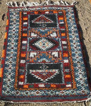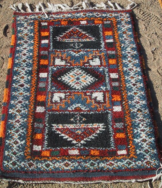 Piece 2.11426 was also made by Samira's grandmother. It's a small knotted rug in the Tazenakht style, in a deep red, grayed blue, gold and black. The large triangles in the black squares are called "takhalalt" in Berber, and they represent a piece of silver jewelry women use as a clasp on clothing; the Romans called them fibula. You can see the details better on the close up. It's about 2 x 3 1/2, measuring 2'1" x 3' 6". The price is $120. It is SOLD but can be remade.