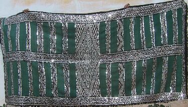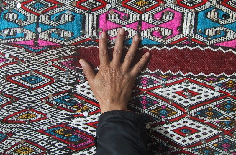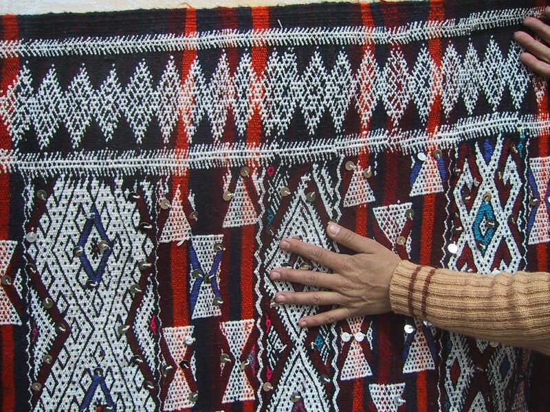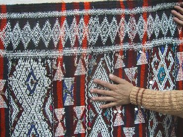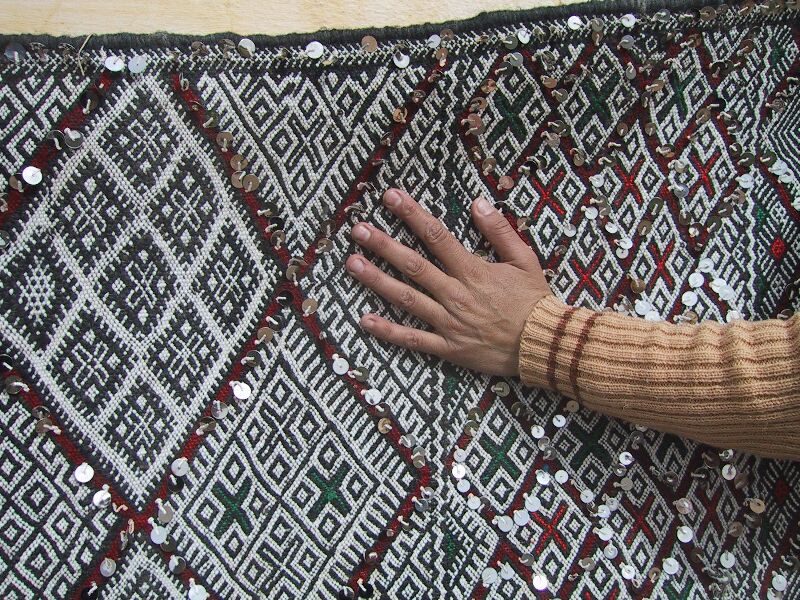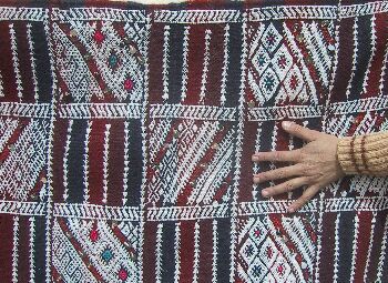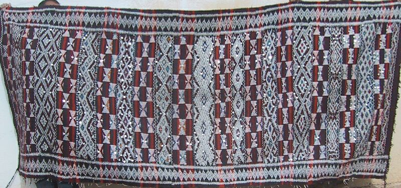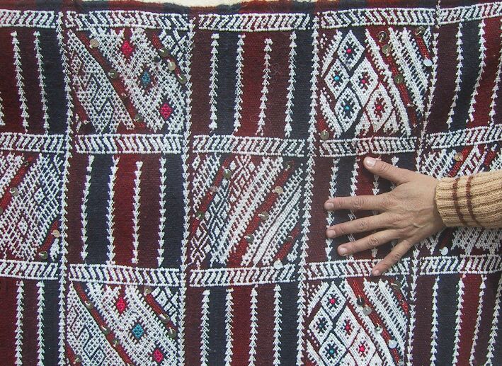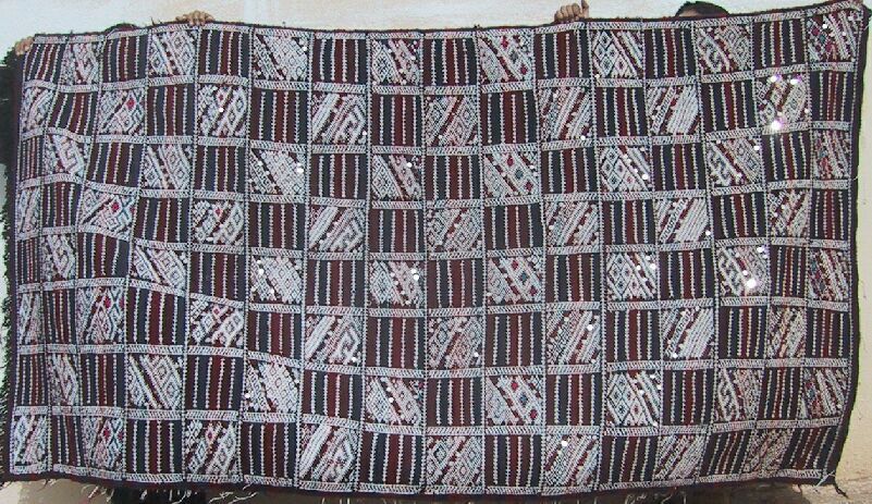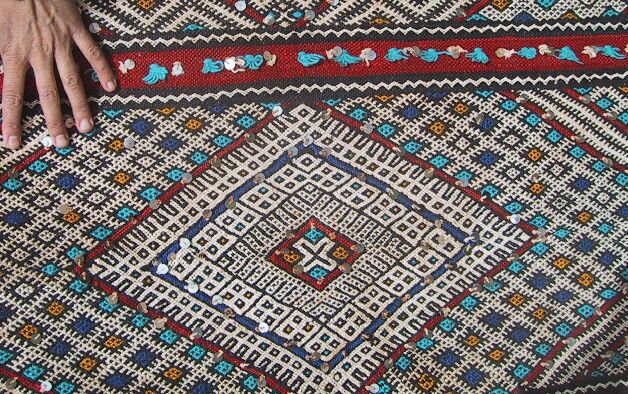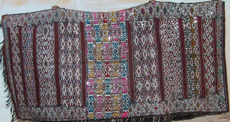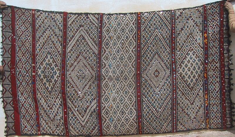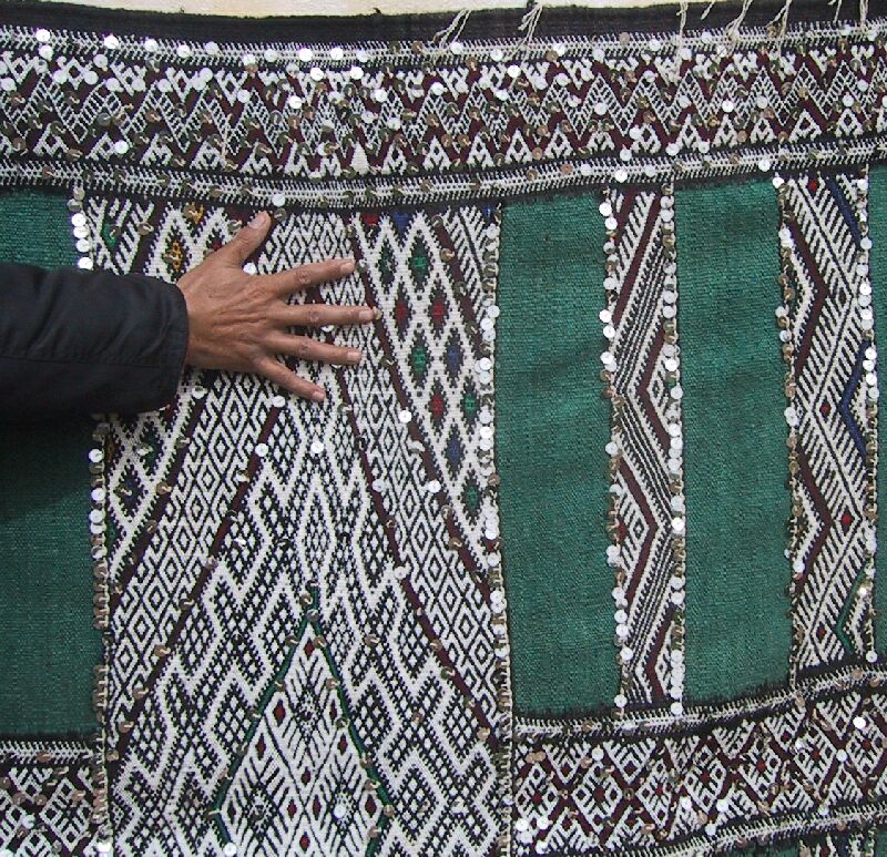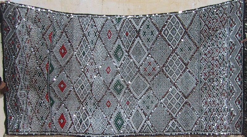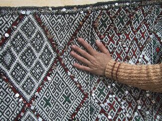 Piece 3.12954 was made by Aicha's sister Mouna Amrar. She was not present for a photo - she works in a cafe in another town to support herself and her daughter. She is divorced because of a bad marital relationship. This piece is a medium size, and traditionally used as a wall covering. It is used daily, not just for special events; Aicha told us it was like putting up a picture to decorate a room. The design consists of geometric patterns overall in large white diamonds outlined in red and sequins, with accents in forest green and neon orange. Click here to see the overall design. This piece measures about 4' x 7.5' and costs $470.