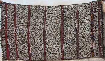 Piece 3.12962 was made by another of Ali's relatives, Rqia Ajidad. She nearly finished her high school degree, but didn't quite make it. It's unusual for a girl with so much education to weave as well. She made this piece and the one below to take with her when she married, but unfortunately she never did. She's now 36, and she and others in her family weave for a living. This piece is a complex local style, with an overall checkerboard design in which plain stripes and design bands alternate in squares. The plain stripes are separated by an arrowhead pattern, found only in the Azrou area, and there are sequins sprinkled in the design squares. While the whole piece would not show up well in the small photo, you can see it here. The main colors are a dark rich red, dark navy blue, and a brown-red. The design squares have accents in turquoise and shocking pink. The size is about 4'9" x 8'6" and the price is $545.