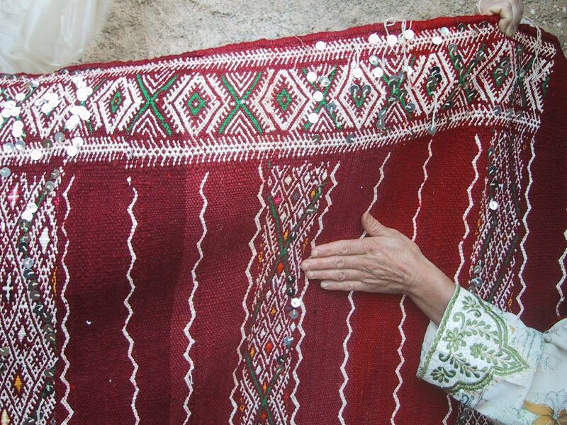 This is Itto Oumoush, who wove the two rugs and several pillows below. She has three children, two boys who are in school and a daughter of one and a half. The oldest son is 12 and lives with his aunt and goes to boarding school in a nearby town, since Ben Smim only has a primary school. Itto's husband works at the post office and also does some farming. When she sells a piece she uses the money to buy materials to start another - a common pattern. She might also use her earnings for household expenses, or to buy something for the children. Last time we visited her we suggested she make some smaller rugs, about 3 x 5 feet, since they fit many spaces so might sell more easily. Stay tuned to see if she does.