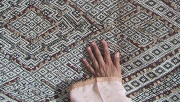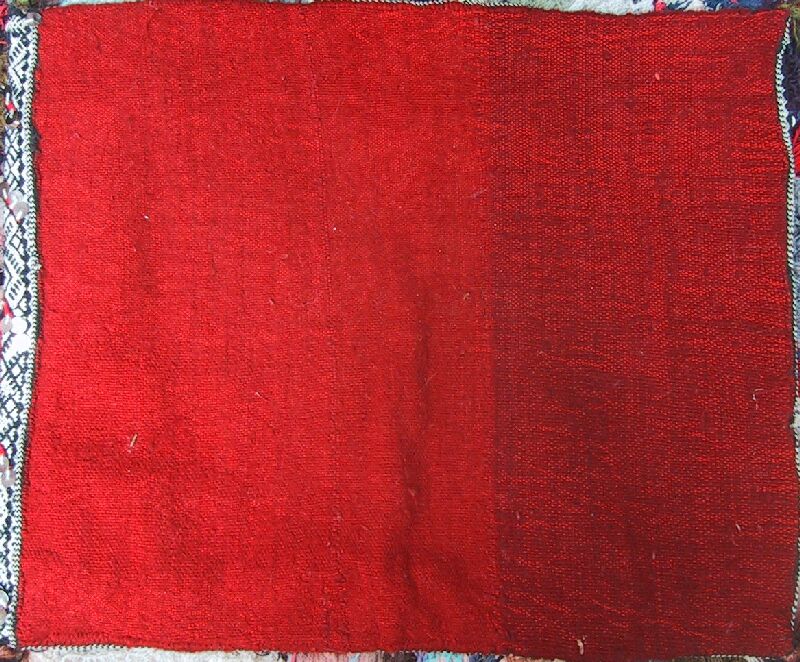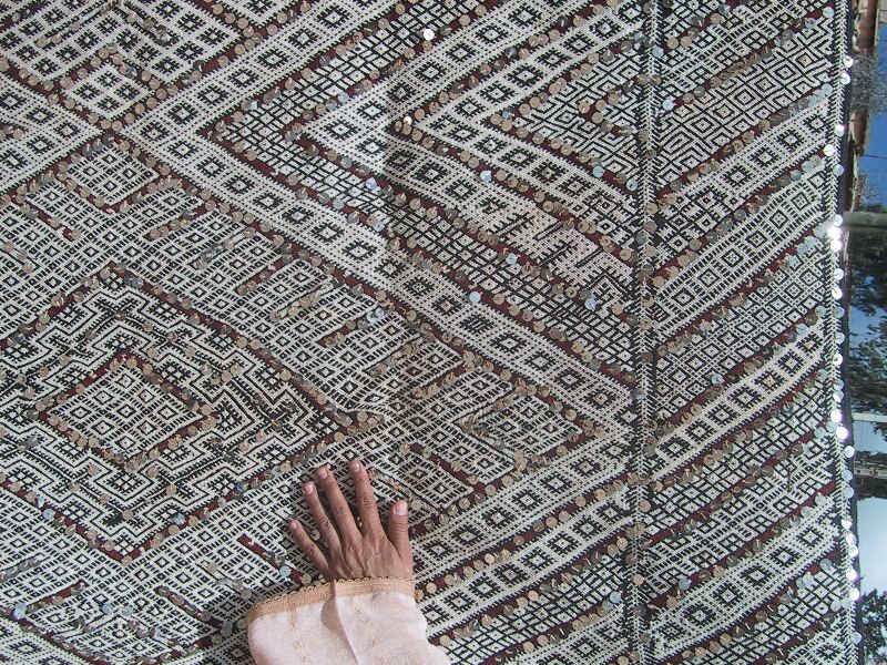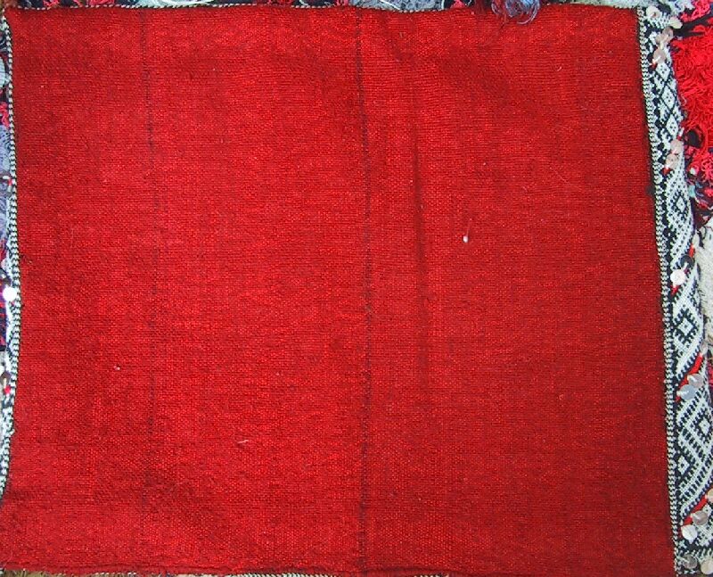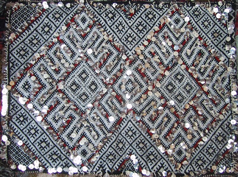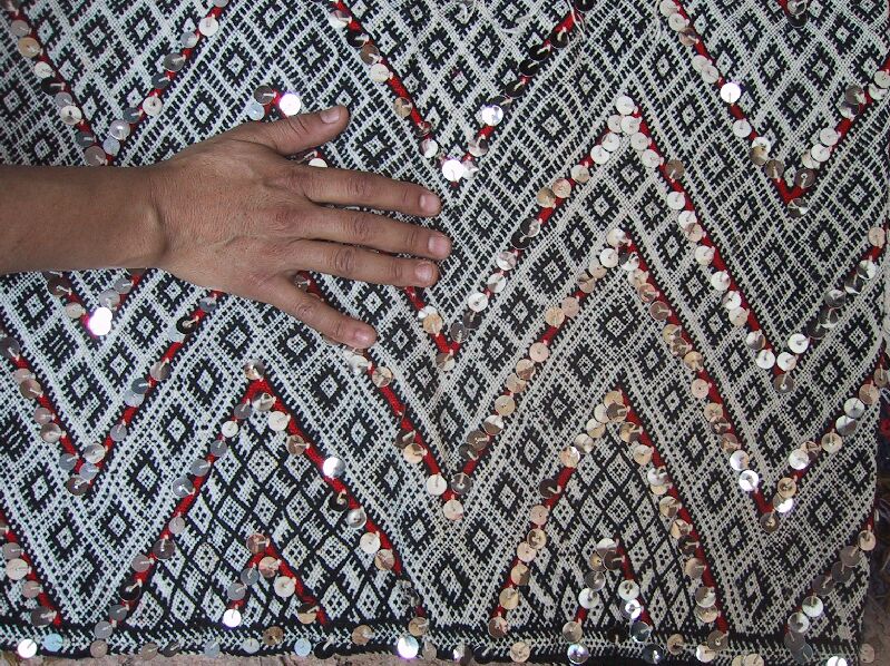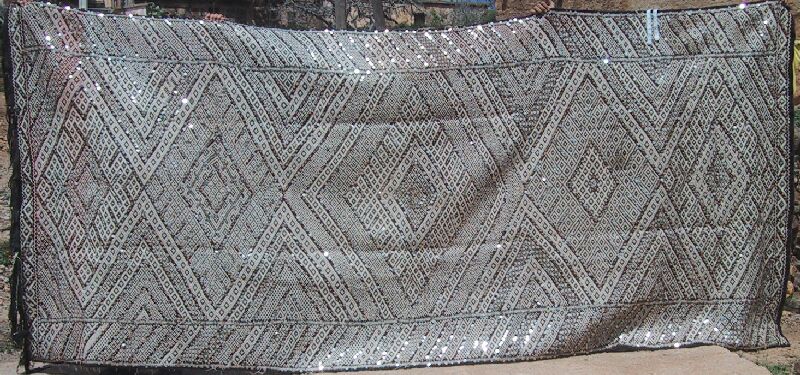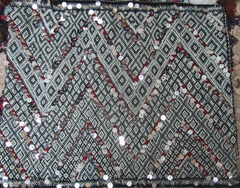 Piece 3.13073 is a large flatweave piece that Itto or her mother probably made for her marriage. It has an overall design in black and white, with accents in red brown yarn and sequins. You can see the colors better by clicking on the photo, and the overall design of the piece by clicking here. There are no plain stripes - the whole surface is covered with this fine design. This kind of weaving takes a long time to do, and that is reflected in the price. It measures about 5'6" x 12'2" and costs $660.
