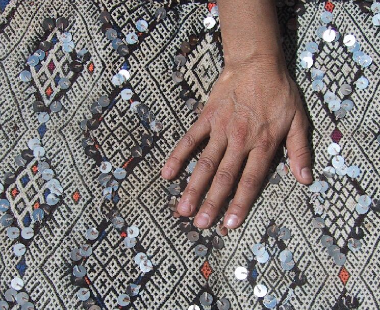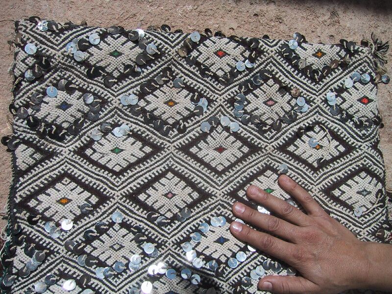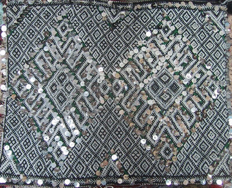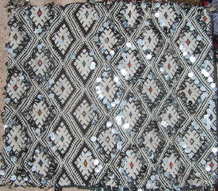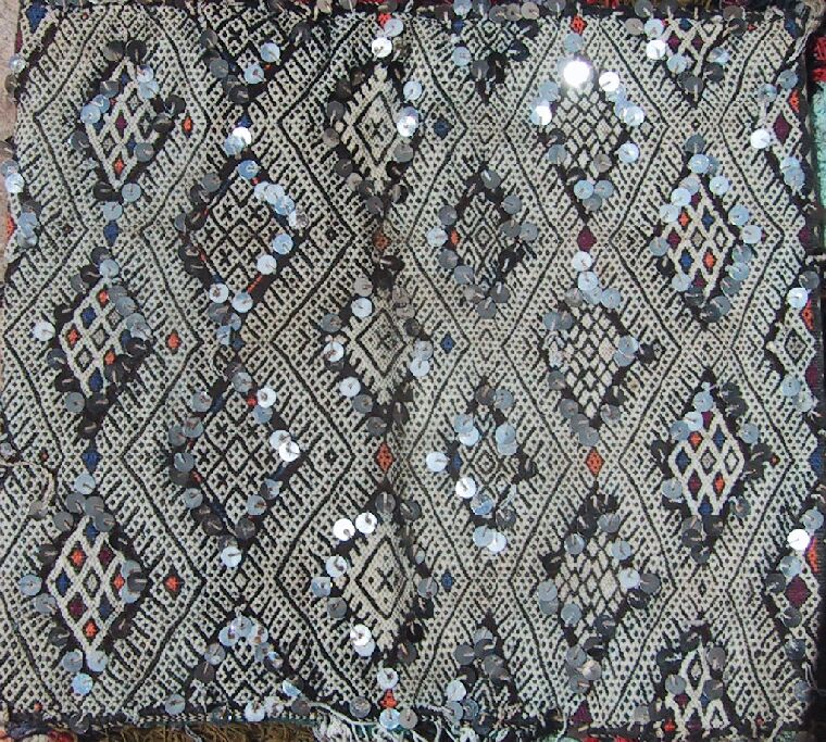 Pillow 3.13056 , also by Itto, has two large diamonds on the face, this time accented in a rich green outline and lots of sequins. Some of the white on the face is actually a shiny gray thread. Habiba explained that it is mainly used to attach sequins, but if you have some left over you might use it to weave. You can see the full pillow here. The back is plain red in two shades. This pillow measures about 18" x 22" and costs $58.