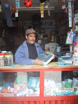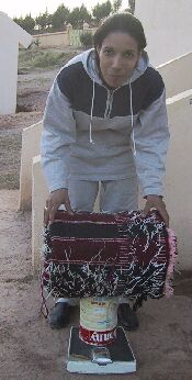 Another person who is assisting with this project is Brahim, one of the local grocers (his wife also weaves). Here you see him in his shop, really a general store, holding the scale we used to weigh the rugs. Since we need to know the weight to calculate the postage to mail the rugs, we needed a scale, and such an item is difficult to find in a village. He was very generous to lend his when we needed it.