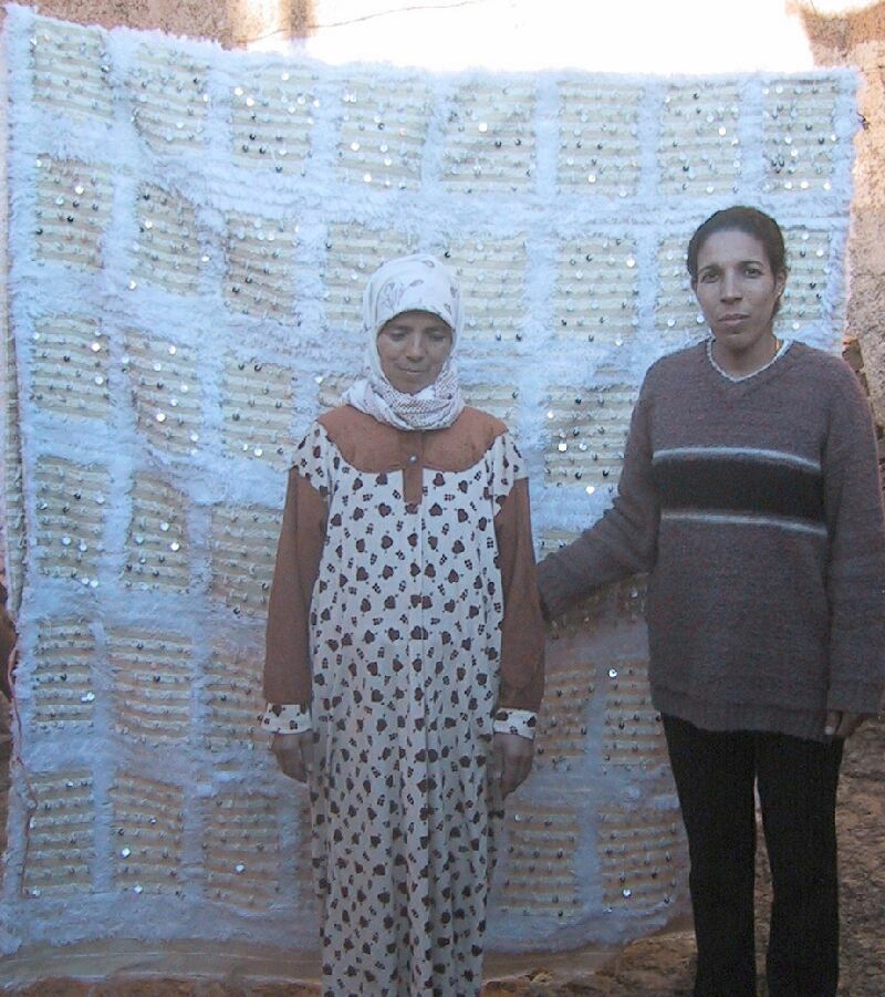 Morocco is a relatively small country, about twice the size of California, and like California has many climates: beaches, mountains, forests, rich plains and deserts. What surprises me is that it has such rich and varied weaving traditions. I have one group of weavers on this site from N'kob, a village in the High Atlas Mountains south of Marrakesh. You will meet another group here, from Ben Smim, a village in the Middle Atlas Mountains about an hour south of Fes or Meknes and quite near Ifrane. Both groups are Berbers, but in the south they speak the Tashelhit or Shilha dialect, while in the Middle Atlas they speak Tamazight. Their weaving is also very different, as you can see by comparing rugs from the different areas. The High Atlas does mainly pile rugs, while the Middle Atlas is mostly flatweaves (though each do some of the other). Another distinguishing characteristic is that in the Middle Atlas they use many sequins, which give the rugs a "sparkle" in sunlight or lantern light, and the designs also vary.