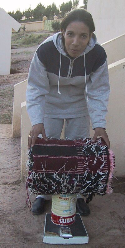 This is how we used the scale. Brahim advised us to roll the rugs up tightly and balance them on an empty can, so that was also part of our equipment.
