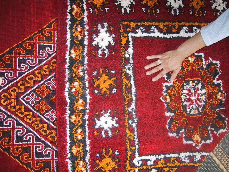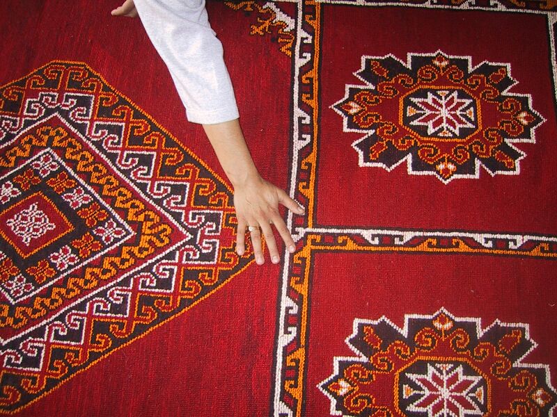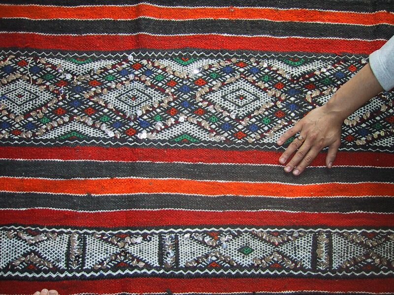 This is Aicha Fadili, and she weaves both flatweave pieces and another style in pile. She is kneeling on one of the pile rugs here, and more of it is shown below. We asked if she could make the same style rug to order in other colors, and she was very reluctant. She was afraid it would not look good, and the buyer would be disappointed. I really appreciated her hesitation: people will often just say "yes" to please you, but this showed me that she's very serious about her craft. You can see that in the quality too. In the background behind her you see another local piece and how it's used - I have some for sale too. It's a bedspread in natural wool with tufts of colored acrylic yarn and lots of sequins.