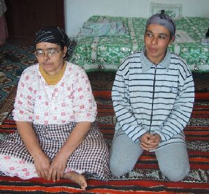 This is Fatima Outaleb with her mother. Although Fatima is from Ben Smim, she does not know how to weave. She went to school for nine years, unusual in the past, so perhaps that took her time instead of weaving. She's married but has no children yet. Her husband works in agriculture sometimes, but has no land of his own. Fatima had the rug below made for her, and now she wants to sell it. She will share the income with her husband, and would like to use it buy an armoire, or free-standing closet, for her home.