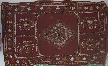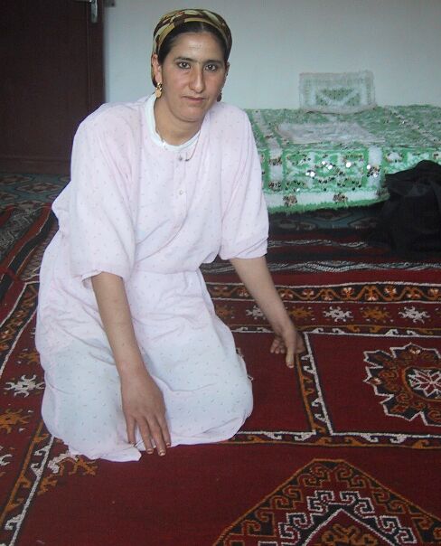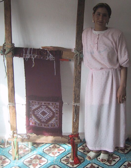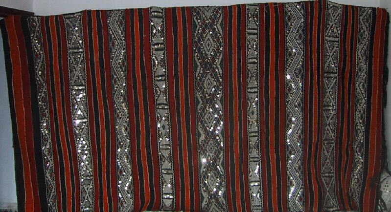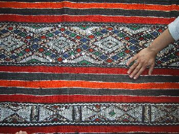 This is Halima Outalb who wove Piece 2.12324 which she's holding. She would use it as a bedspread, but it could also be a wall hanging. It is made of wool and cotton and has acrylic yarn fringe. There are thin design bands with colored accents and sequins; click here to see them better. The off-white is wool and the bright white cotton. Halima is in her early thirties and married, but has no children yet. Her husband works off and on, sometimes as a woodcutter (it snows here in the winter and people heat their homes with wood stoves) and sometimes working metal. Although she's never been to school, she attended literacy classes last year taught by Habiba, the project assistant. If she sells her piece, she may buy something for her home. This piece measures about 5'1" x 8'4" and costs $275.