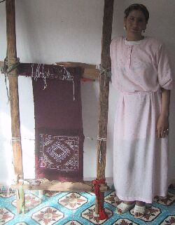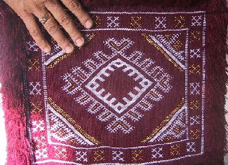 Aicha also wove the pillow below on this loom. The photo shows you how pillows are made: although they have two faces with different designs (here one face is plain), they are made in one piece. You can see the back of an identical pillow that has been finished and rolled up on the top of the loom.