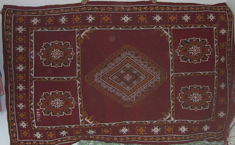 Piece 2.12309 is a rich, deep red pile rug, which in fact can be used on either side. It has accents in black, white and a yellow-gold. An unusual touch is the weaver's name woven into the lower left corner. If you click here you can see a close-up of the flatweave side, and here shows you that plus the pile side (with her hand on it) for contrast. This is a large piece measuring about 6' x 9'8" and costs $460. SOLD but she may have a similar one.