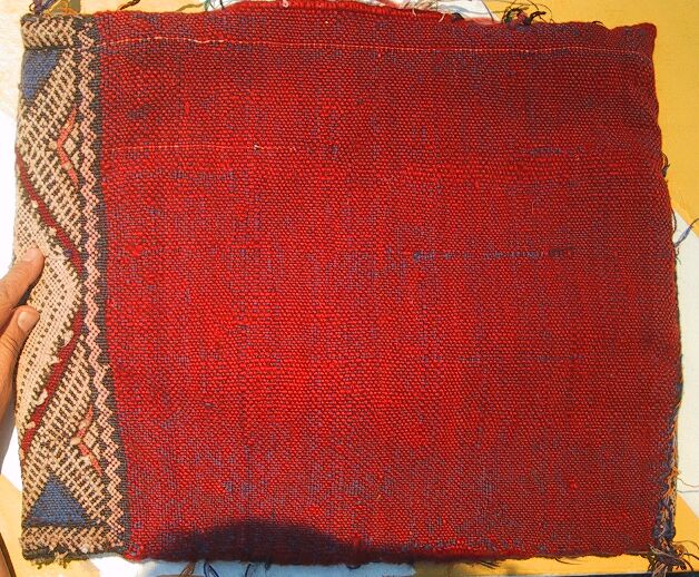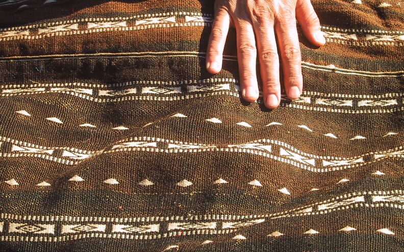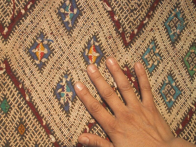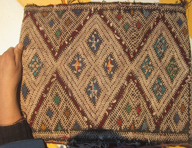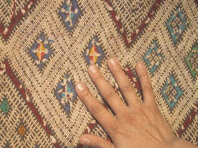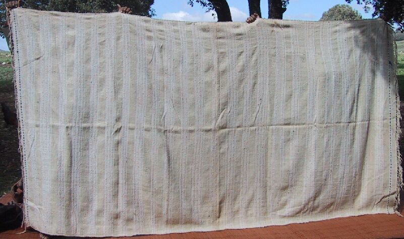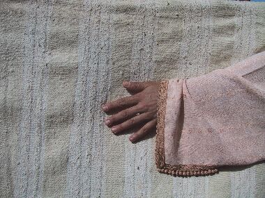 Piece 3.13075 is a large blanket in natural off-white wool with stripes in cotton and herir, which is probably rayon. You can see the details better (including Habiba's elegant jellaba fabric and trim] by clicking on the photo, and you can see the whole piece here. This would make a lovely blanket, or even heavy drapes if you had a small area. The size is 5'5" x 10' and the price is $215.