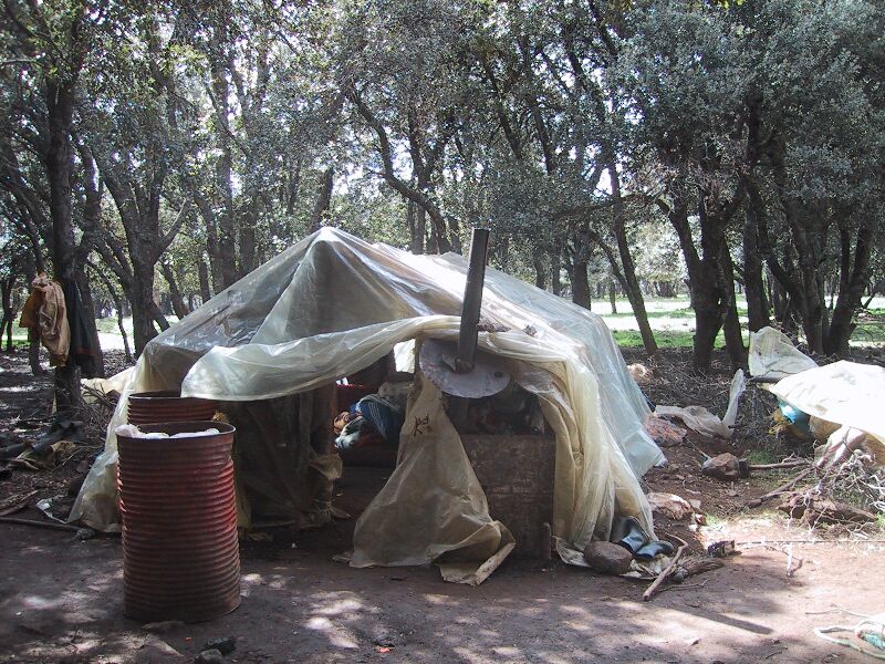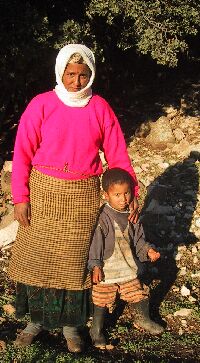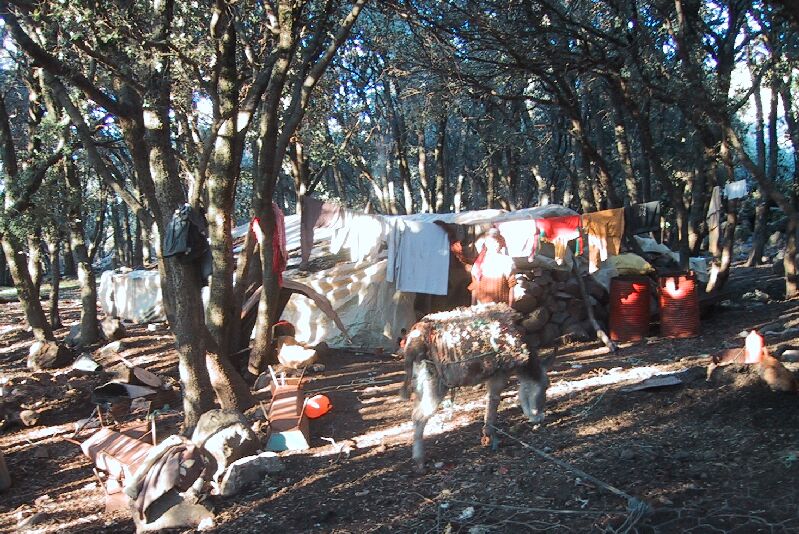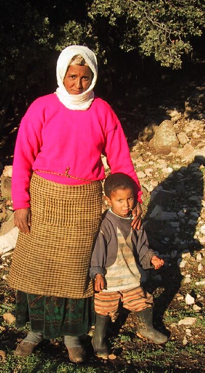 This is Zahra Aarab, whose family works as shepherds. Most of the year they are out with the herds of sheep in a low black tent. When it starts to rain, they move to a plastic tent sheltered in the trees. If you click here, you can see that tent in November, with the laundry out to dry and the local transportation parked in front. When it gets really cold, the family moves back to Ben Smim (this photo is about 4 miles away) with their animals and feed them at home instead of taking them out to graze. Zahra has four children ranging from 14 to 3; you see the smallest son here. She has two boys and two girls. The oldest is a son who helps herd sheep, and the next a daughter of 12 who helps with household chores - she had made dinner the day we visited. The only child in school is a daughter in second grade who stays with a family in a nearby town. When the family is herding, the lack of a nearby school means the children can't study. In fact, there is a campaign to encourage families to enroll girls in school, and in some places they are given flour and oil if they do so. It's possible that may have encouraged this family.