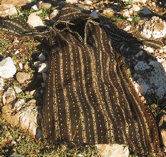 Piece 2.12563 is a jellaba, a hooded garment worn by both men and women in Morocco. This is a man's jellaba, woven of natural brown wool. Women's are usually in synthetic fabrics. This is an older piece, very finely woven, and the design is typical of the area. You can see both the fine weaving and the variation in browns on the close-up. The length from the back of the neck to the ground it 52" and the shoulders are 40" (they are cut loosely) and the hips 54". The price is $225.