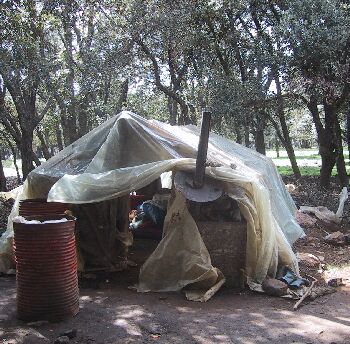 This is another version of the waterproof winter tent. The pipe on the right is for a wood-burning stove, and if you click on the photo you can see some of the wood they have collected to burn. They carry water from a nearby spring for themselves and the animals.