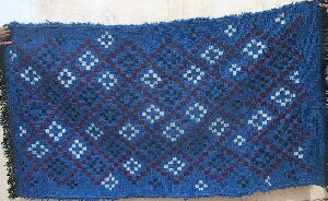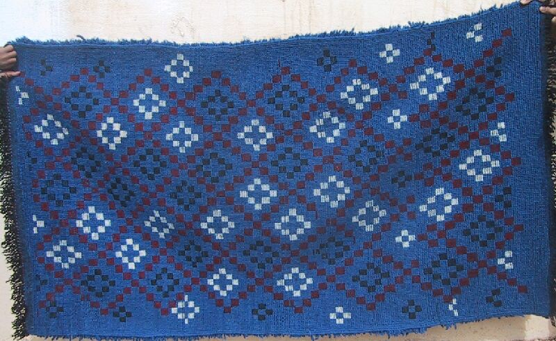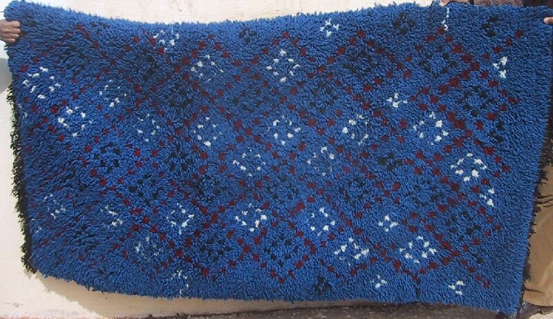 Piece 3.12885 is a knotted rug in royal blue with accents in white, black and dark red. In the photo you see the flat face of the rug, and you can see a close-up of it here. Click here to see a full photo of the pile side, and here for a close-up. Moroccans use both faces of these rugs: the flat side is cool in the summer, and the knotted or pile side is warmer in the winter. This is a medium-sized piece, measuring about 3'4" x 6', and the price is $380.