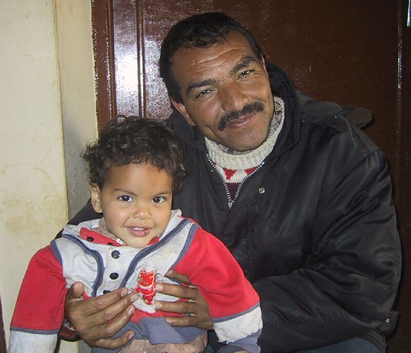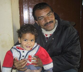 This is Muhsin, the baby above, about six months after the previous photo. He was almost walking at this point. He is with his father Ali, the guard at the school where we have photographed many rugs. Moroccan fathers usually have very warm relations with their small children, and you can see that in this picture.