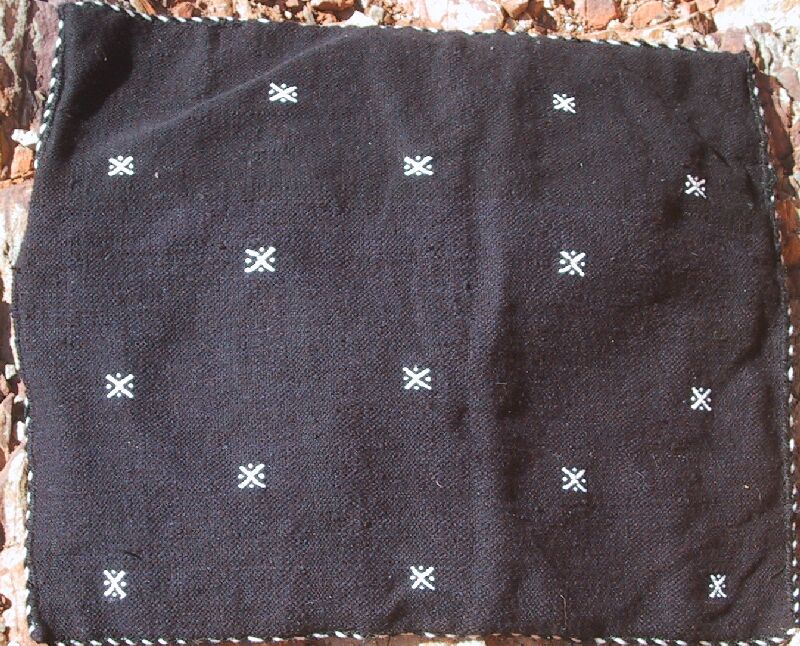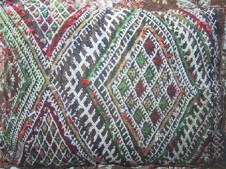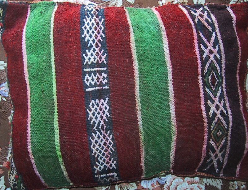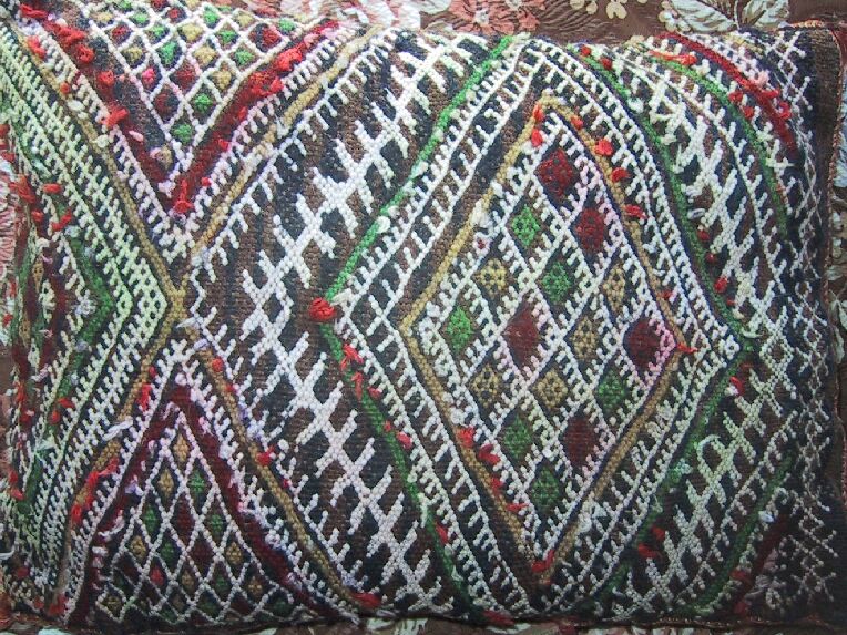 Piece 1.12545 is a small pillow that Kebira Outalb had made for her. Although she weaves, she only knows how to do a pattern of simple stripes. This pillow is much more complicated. It has more colors than most, including dark red, forest green, tan, black, white and brown. On the close-up you can see the brown and blue outlining the large diamond on the lower left, which is a color combination found in some old rugs and rarely seen today. You may also note that some red has run onto the white design - it will be fixed (with chlorox) before the pillow is sent. The back has stripes in dark red, blue, black and forest green. This pillow is already stuffed with wool, as rural people do, and will be sent that way. The size is 11.5" x 16" and the price is $56.