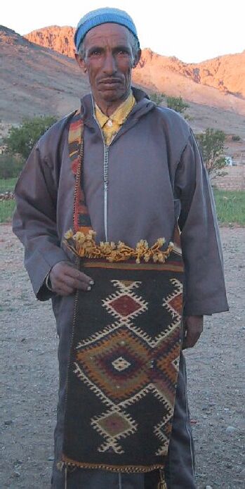 You don't see many men in these photos, but this item is a travel bag traditionally used by men, so a man is demonstrating how it is worn. It was woven by Fadma Buhassi, the mother of Fatima, the young woman above. You can click on the photo to see it more clearly. Although it looks like an antique, it was woven about 3 years ago.
