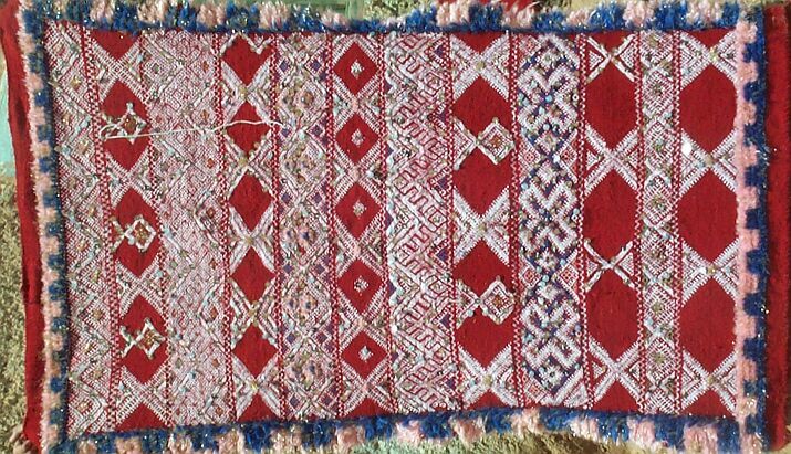 Piece 3.6014 is quite unique. It is basically a flatweave piece or hanbel, but is decorated with tufts of pink, blue and metallic gold yarn around the edge. That yarn is probably machine made and acrylic, while the red base of the rug is hand spun wool and the white design is made in what is called "silk" but is probably rayon or cotton. Within the white there are colored accents in blue, light blue, light green, pink and gold. The white design looks a bit fuzzy because there are also some pink tufts within it, which you can see in this detail. Evidently feeling it needed more decoration, Aicha added sequins, much favored in this area. Another unique aspect is the asymmetrical overall design. That's one of the things I love about these rugs: you can just keep looking at them and discovering new aspects. This piece measures about 3'2" x 5'4" (96 x 162 cm) and costs $195.