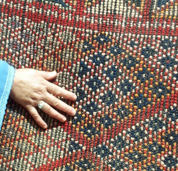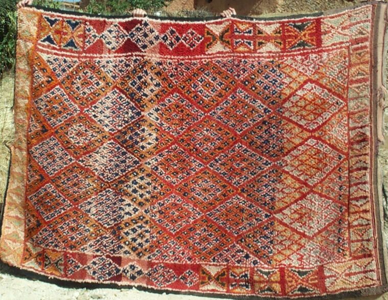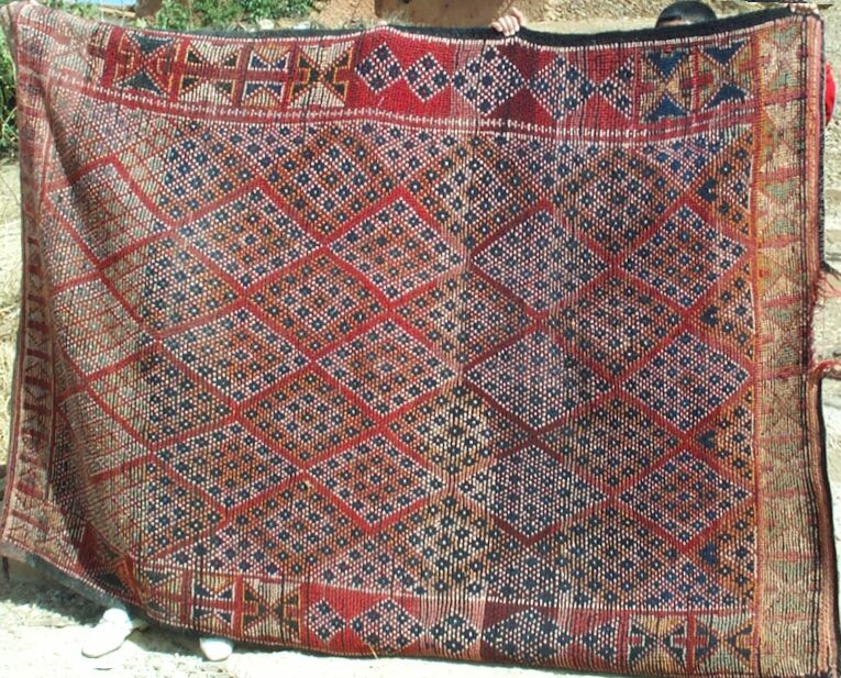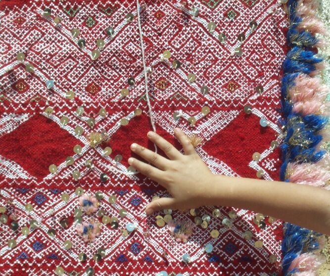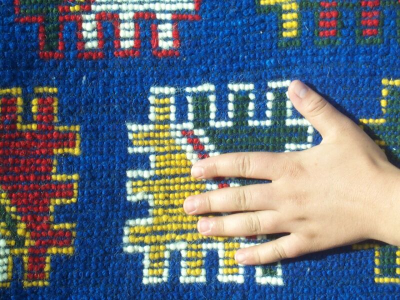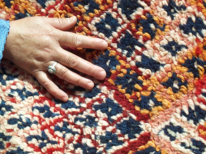 The piece below was made by Rqia Baikou. She has four children, two sons and two daughters. If this rug sells, she will buy materials to start another one.