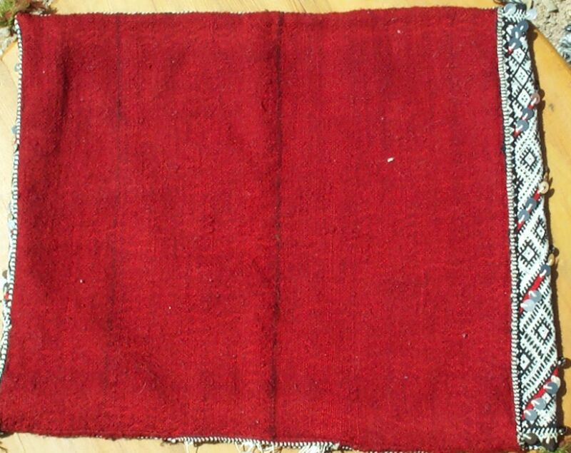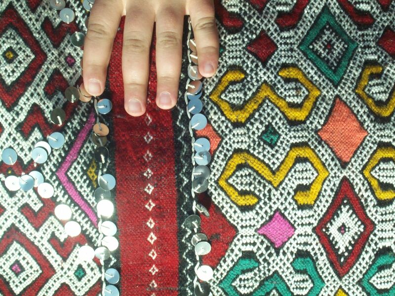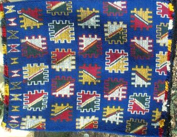 The pillow below was made by Itto Oumoush, whose photo, pillows and rugs you have seen before. Her husband works at the village post office and also farms - the last time we visited she was about to take him lunch in the fields. They have three children, two boys who are in school and a daughter of one and a half. The oldest son is 12 and lives with his aunt and goes to boarding school in a nearby town, since Ben Smim only has a primary school. When Itto sells a piece she uses the money to buy materials to start another - a common pattern. Notice the shimmer of the sequins, which can be quite lovely.