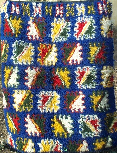 The two colorful rugs below were made by Fatima Amrar, the sister of Aicha above. Her husband is the guard at a school just like Aicha's husband Ali, but he works at a junior high school. The couple has three childlren, the oldest of whom is seventeen and the youngest seven. Fatima's earnings go to help her husband to support the family.