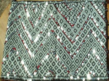 Piece 3.6039 is a pillow with an overall zig-zag design in black and white with red accents, trimmed with sequins. You can see the excellent weaving in this close-up. The back is plain red, except for a bit of the design that has run over. It measures about 1'6" x 1'10" (46 x 56cm) and costs $60.