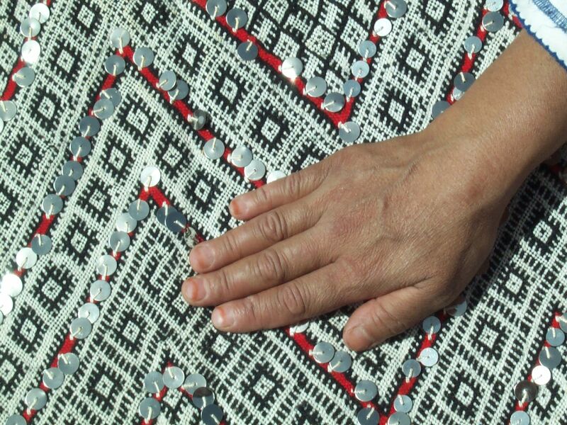 Piece 3.6020 is more typical of this area, although the bright pink, yellow, orange and green are relatively recent. They are probably made in acrylic sweater yarn, since local dyers don't usually make these colors. The strong design elements, like the colorful "3s" in some of the white rows, are also fairly recent. On the other hand, the red and white diamonds on the left of the hand in this detail are very traditional, as are the sequins. This piece measures about 3'2" x 5' (96 x 152 cm) and costs $300.