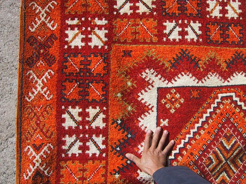 This is Rqia Akhrass, a dignified older woman in N'kob. Her family said she made the four rugs below in the sixties, and they have kept them in good condition until now. Notice the difference in colors and design from most of the N'kob rugs you've seen. These are mainly red and orange, and the designs appear to be more overall than the three-panel style. In fact, three of the rugs below have three sections, but they are much less marked than in most of today's rugs. Rqia lives with her aging and blind husband and her three sons' families, all in one home. She also has three daughters, but they too are grown up and have married and left. The pretty Khadija Id Yassine above is one of her daughters-in-law, and the village maqqadam or local official is her son. You will notice these prices are much higher than other pieces. One reason for this is that they are older and in excellent condition: you rarely see items like this for sale any more. Again, the men set the prices and I did not discuss them.