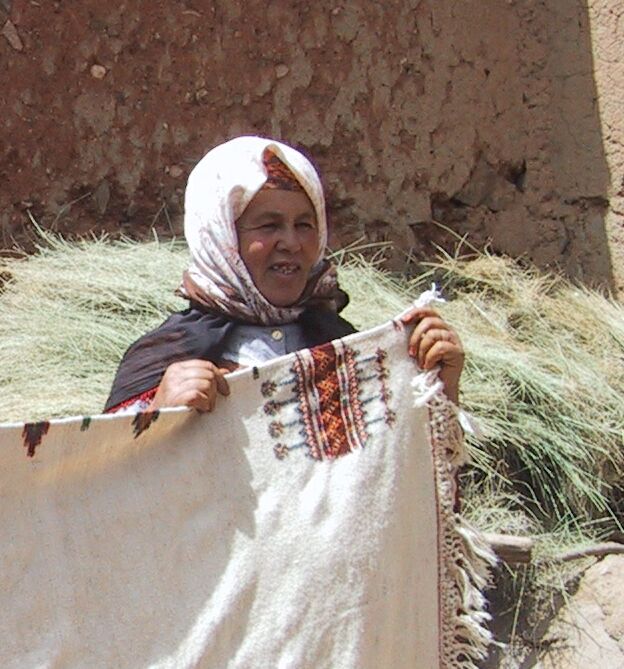 This is Aicha Seqqat, one of N'kob's two femmes leaders or women leaders; you have seen her before. When the village development association wants to inform women about anything (including health - or - coming to have their rugs photographed for the Internet), they have Aicha and her colleague Fadma contact the rest of the women. Most of her children are older, but one daughter weaves with her, and made the woman's cloak that she is holding - you can read about ordering it earlier in these pages. Aicha's husband washes rugs to prepare them for sale, and Aicha made the two rugs below.