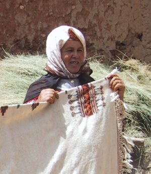 This is Fadma Bourais and she made the rug below. She has three children, two married daughters and a son who is in junior high school in the town of Ouarzazate about 2 hours away. The village only has a primary school, so further education means boarding in town, and this often stops girls from continuing. Her husband sells vegetables in the same town and comes home on weekends; he and the son probably share housekeeping in town. Fadma made the rug by herself in seven months. When we asked what she would do with the money, she first said "buy tea," meaning household expenses, just for one month. When we said we thought it should cover more than that, she said "not even that." Another thing she needs to buy are school books and supplies for her son.