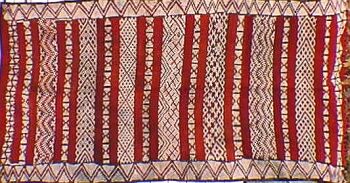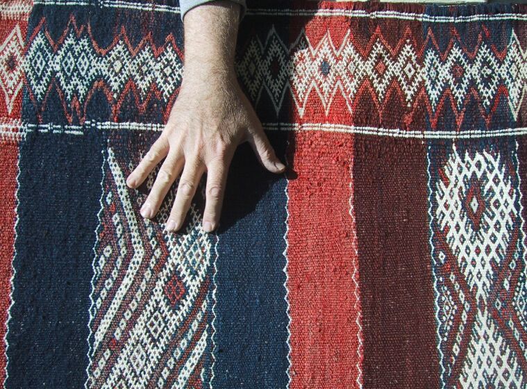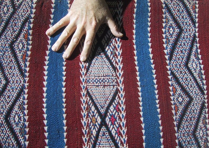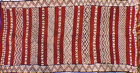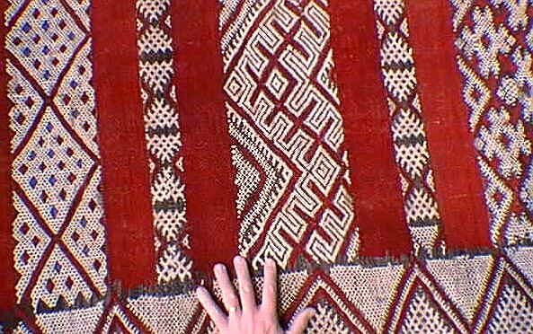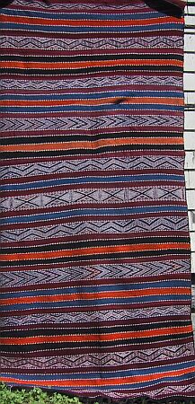 Piece 4.14004 is a large flatweave from the Middle Atlas area of Morocco, south of the cities of Fes and Meknes. I have been told that the white arrow shapes that separate the plain-colored bands means that the rug is from the area of Azrou. You can see them well in this detail. The mauve and blue also show up well there; the other plain colors are black and orange. The size is almost 5 x 10 1/2 feet (145 x 320 cm) and the price is $625.
