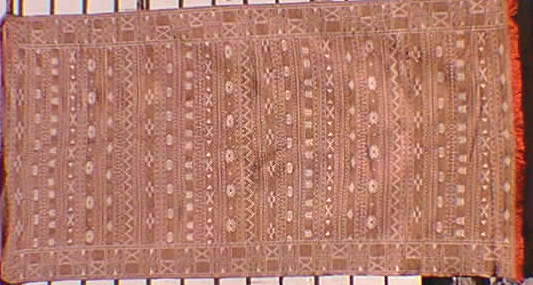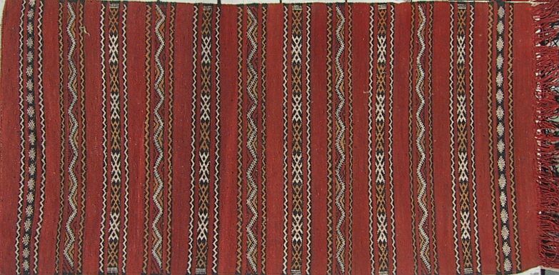 Piece 4.14532 is in a muted brick red with accents in black, white and a cumin/brown tone. It has no borders, and a calm pattern. You can see the pattern better in this detail. The size is about 26" x 51" (about 66 x 130 cm) and the price is $95. SOLD