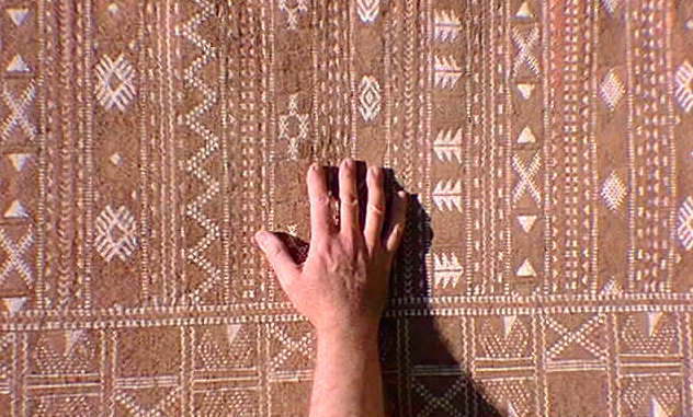 Piece 0.051548 is a pink-beige with greenish-brown undertones, and fine white designs. It almost looks like there are woven designs dyed-over in some areas, so there’s a faint texture but not a color difference, although in a few places the pine tree design seems to have a darker shadow next to it. You see this better in artificial than in natural light. It is wool with a red cotton warp or base which gives it the pinky tint, and has white cotton in the design. You can see the color in this overview. It measures 4’1” x 7’9” and costs $355.